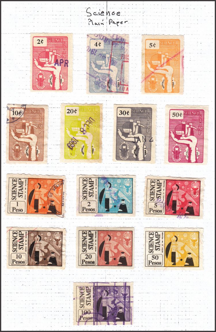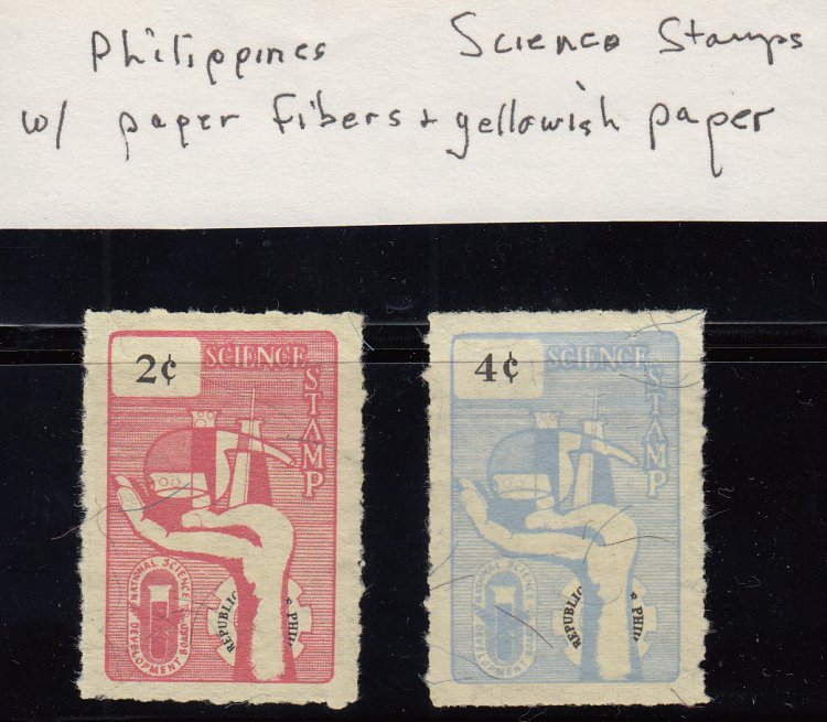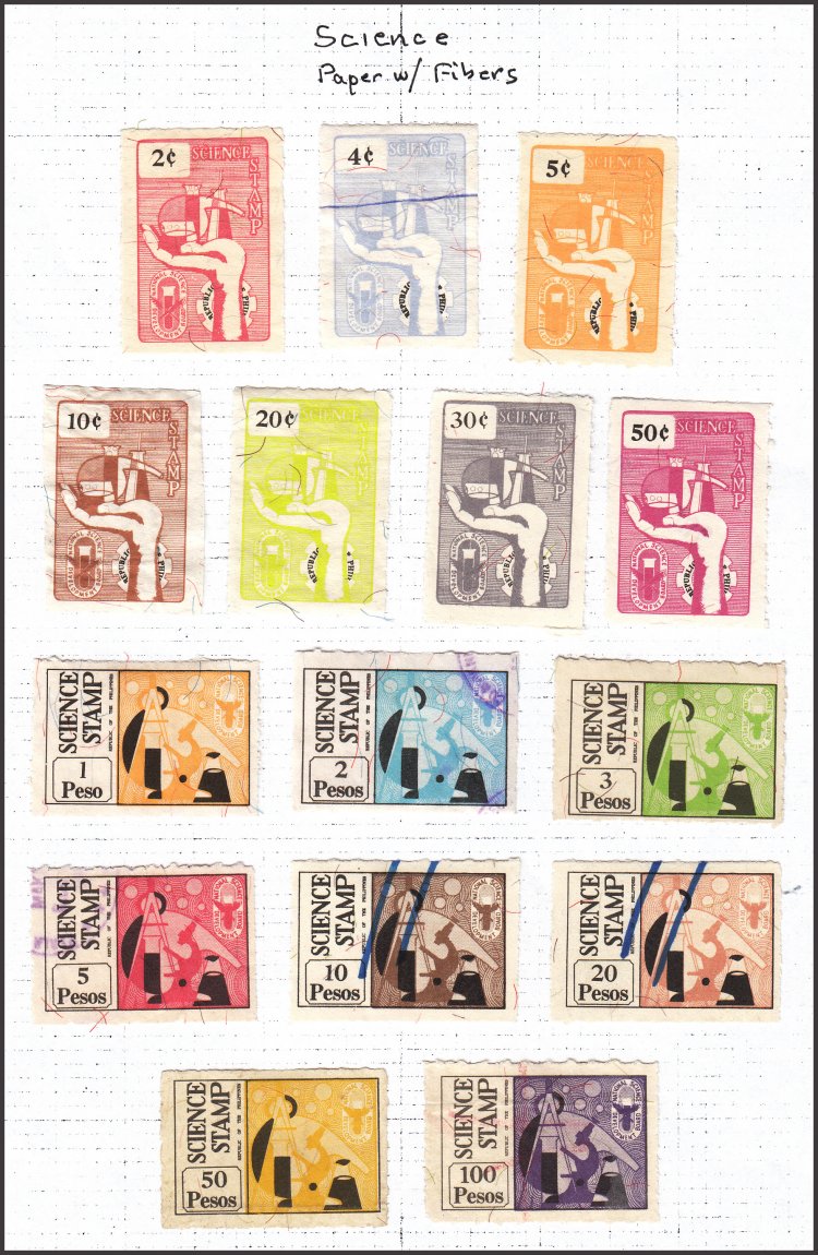 sets of Science Stamps, one showing Plain Paper and one set with Fibre Paper.
