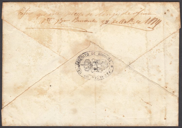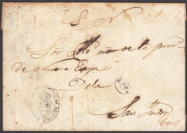 October 1874) Departure Circular Date Stamp. Manuscript S.N. (Servicio Nacional) on top of cover, authorising free