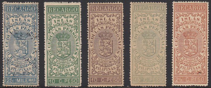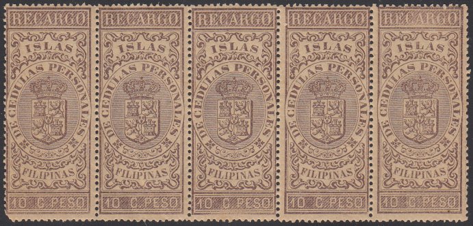 Warren W250 (5). Mint (OG, NH). 10c Recargo de Cedulas Personales issue, horizontal strip of five. Rounded perf on