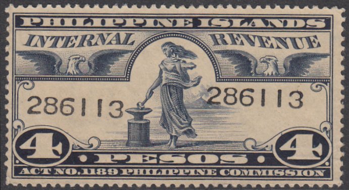 Internal Revenue 4p 1934 stamp. Well centred, vibrant colour. One blunt perf