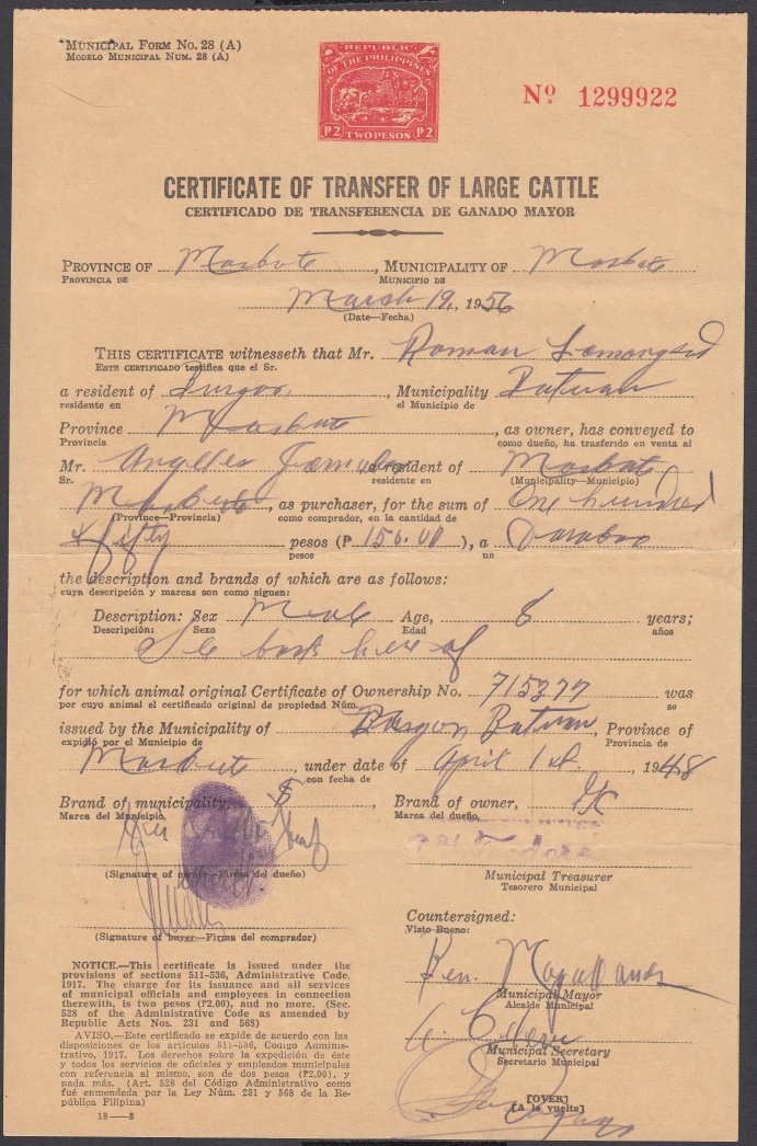 Transfer of Large Cattle Document. Issued in Masbate, 19 March 1956.
