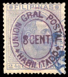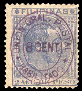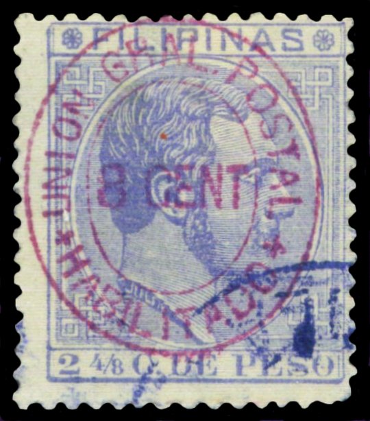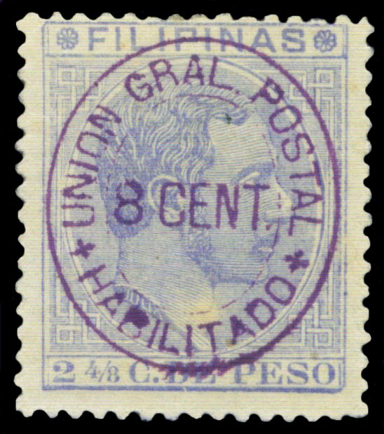 Scott # 105 December 3, 1887 8c Magenta Surcharge on 2-4/8c Ultramarine (First Retouch) Surcharged on 2-4/8c ultramarine King Alfonso