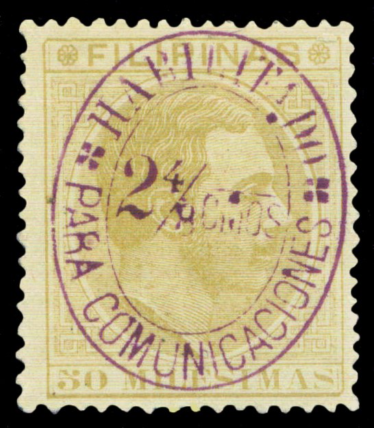 Scott # 110 February 27, 1888 2-4/8c Magenta Surcharge on 50m Bistre Surcharged on 50m bistre King Alfonso XII issue