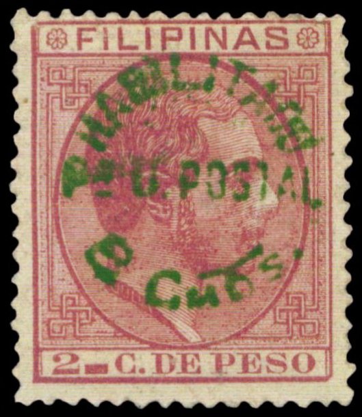 Scott # 95 June 4, 1883 8c Green Surcharge on 2c Carmine Surcharged on 2c carmine King Alfonso XII issue