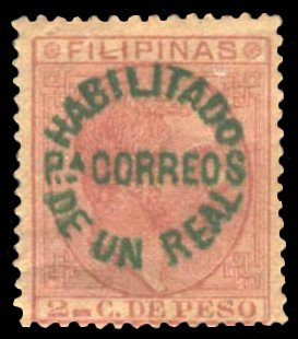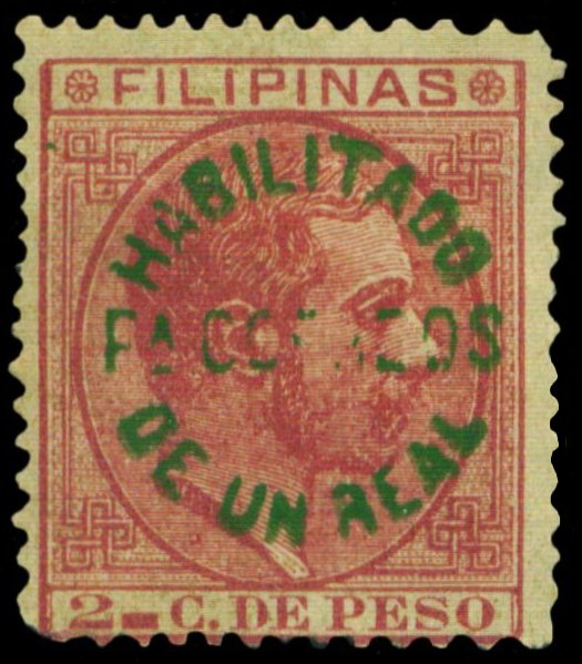 Scott # 97 June 4, 1883 1r Green Surcharge on 2c Carmine Surcharged on 2c carmine King Alfonso XII issue