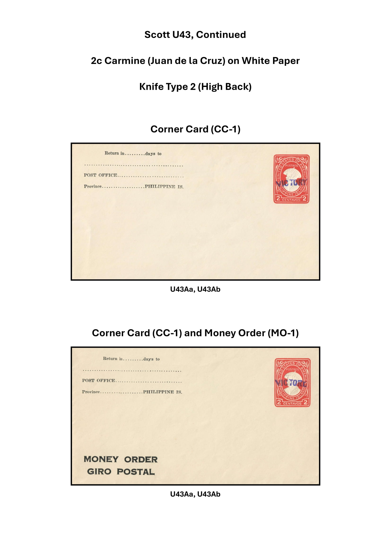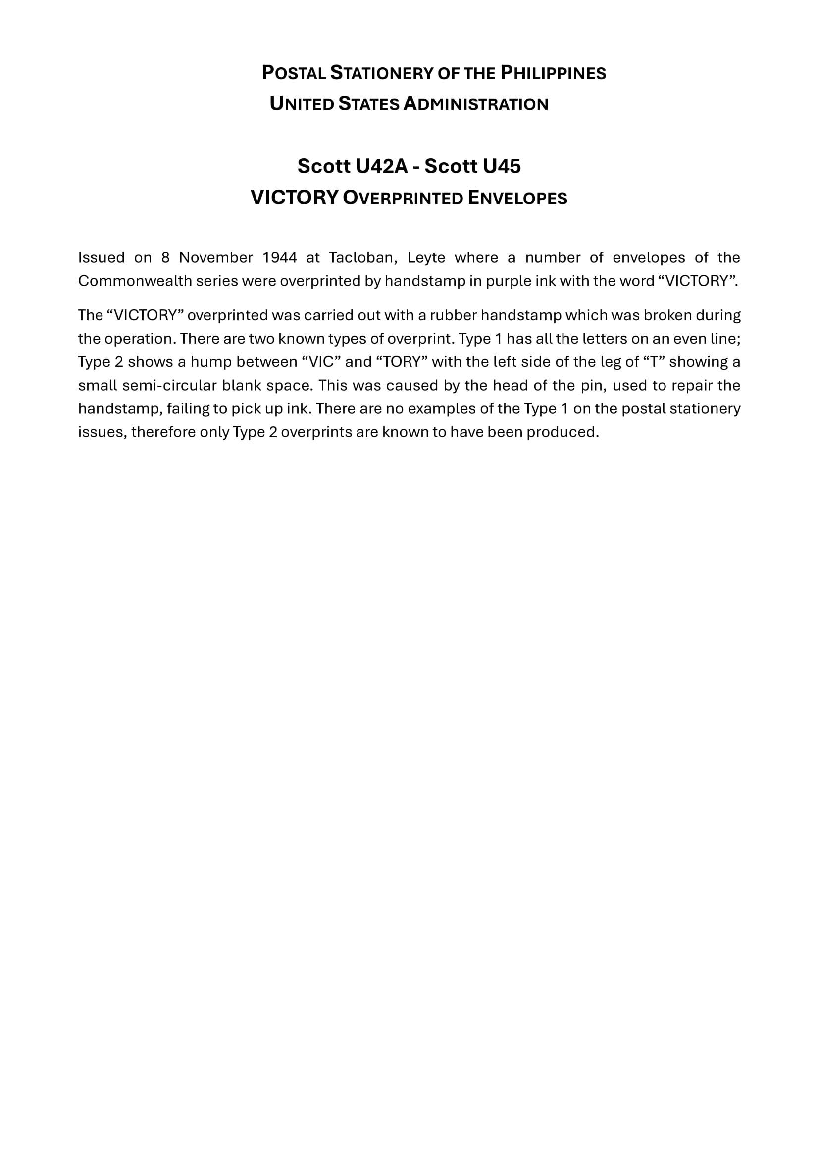 VICTORY Overprints Scott U42A to Scott U45 UPSS-119 to UPSS-125