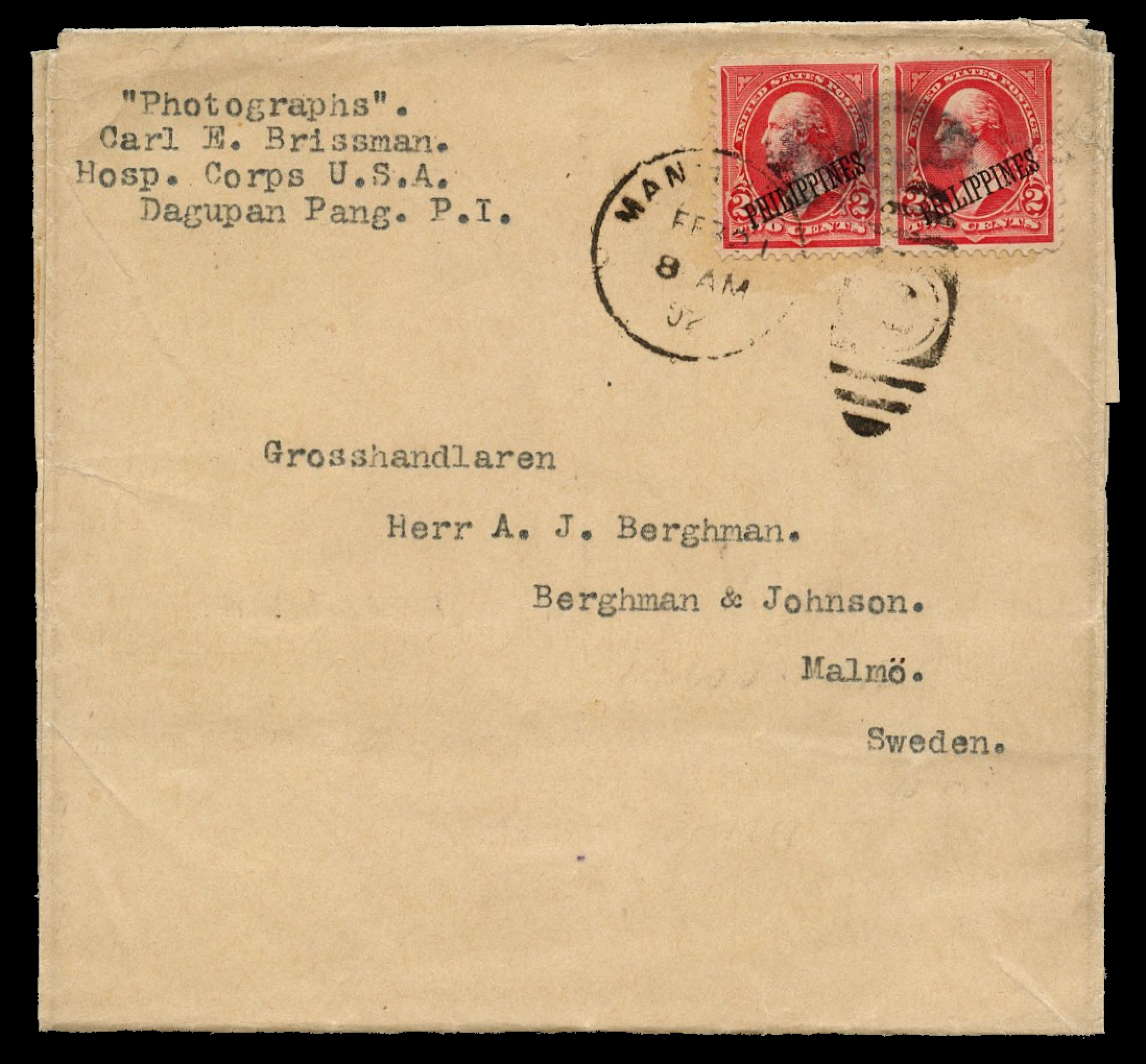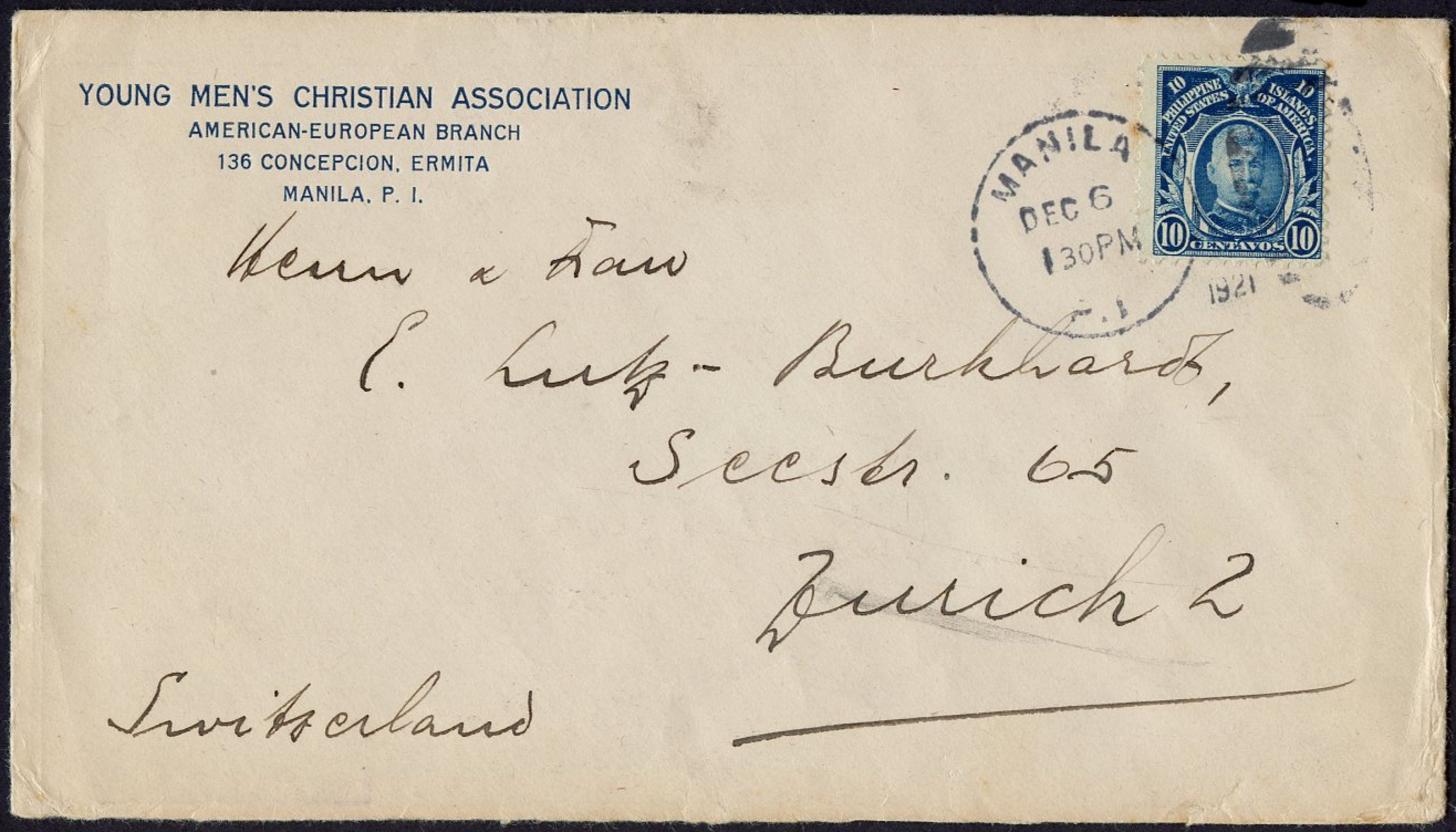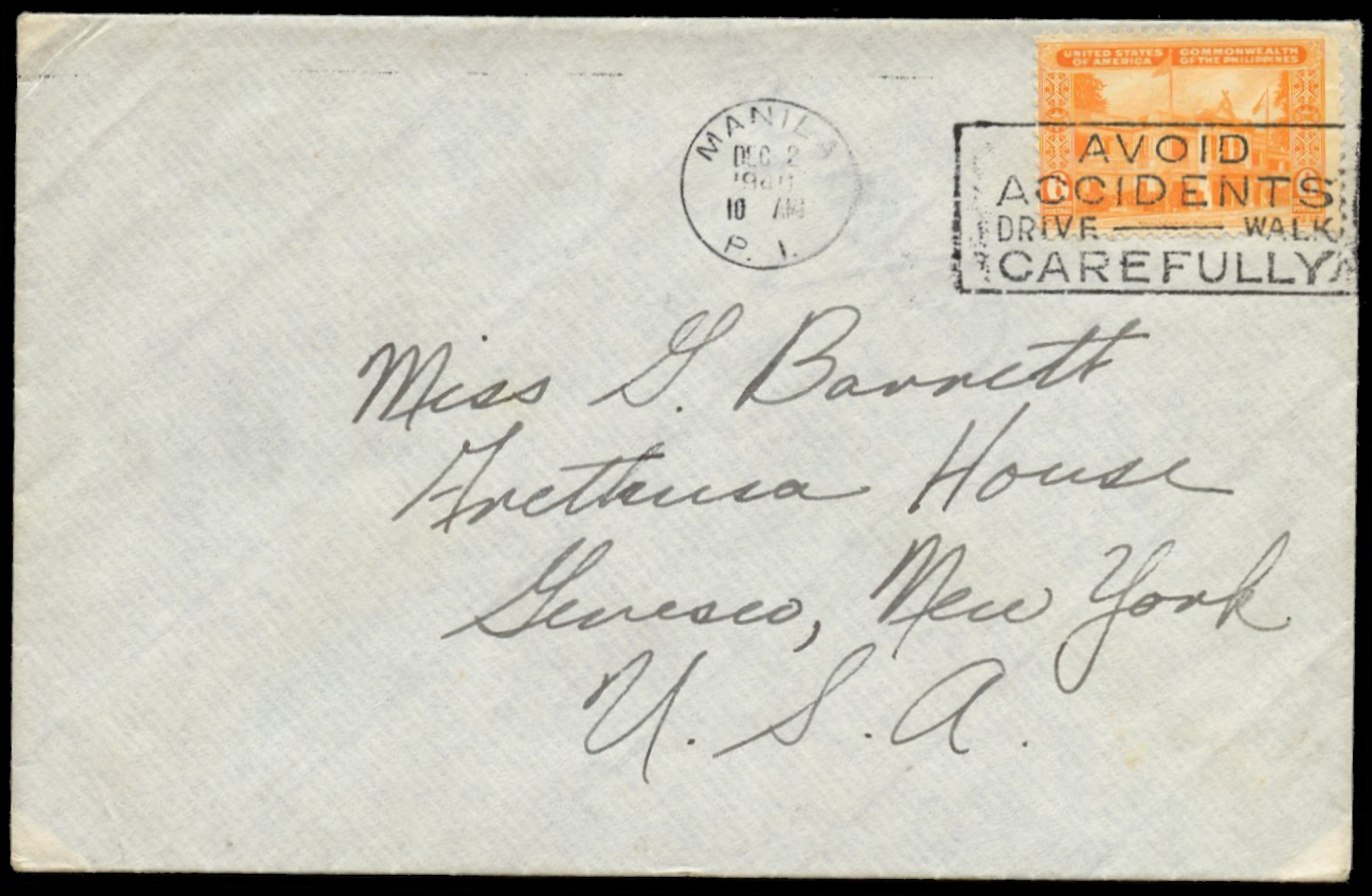 Pre-Printed Cover Piece from Manila with US 10c Regular issue affixed and